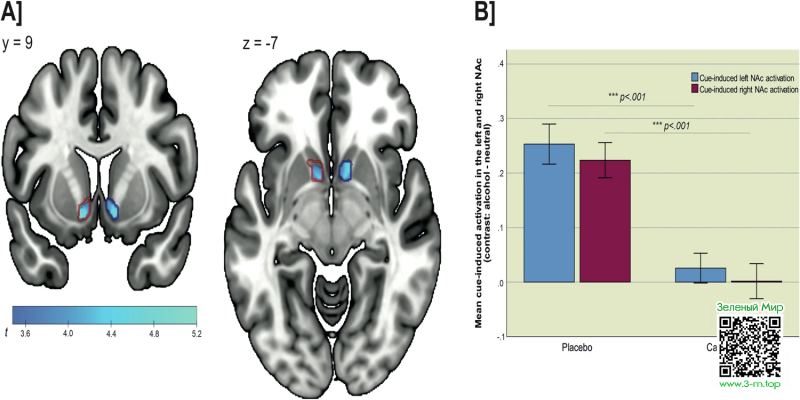 На изображённой диаграмме видно, что под действием КБД активация кластера нейронов в прилежащем ядре, расположенном в правом полушарии, практически полностью сошла на нет, а скопление нервных клеток в прилежащем ядре в левом полушарии активировалось в гораздо меньшей степени, чем у людей, принимавших плацебо. Этот факт говорит о том, что каннабидиол почти полностью устранял тягу к алкоголю у волонтёров и облегчал, таким образом, один из симптомов алкоголизма.