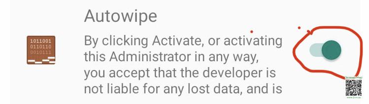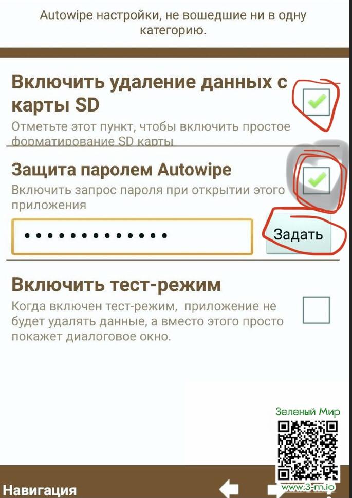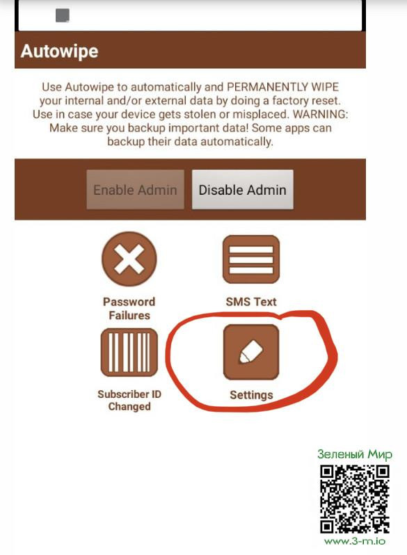 В настройках ставим флажки напротив "включить удаление данных с sd карты и "защита приложения паролем" , пароль ставим большой.
