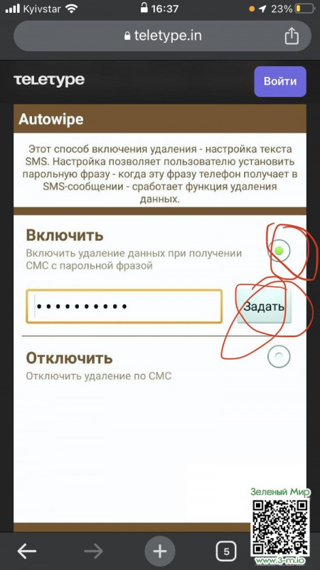 Переходим в раздел "SMS Text", выбираем "включить", вводим текст(я рекомендую 1234) и нажимаем кнопку "задать".
