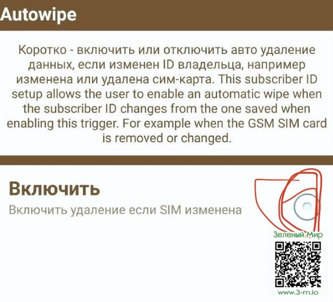В меню "Subscribed ID change" включаем режим удаления при изменения SIM карты.