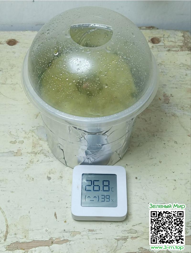 А теперь выкручиваем в доме все лампы из люстр и врубаем их ростку. Чтоб впустую не жечь лишнее электричество основным светом, я на этом этапе использую обычную производственную лампочку на 60W с температурой свечения 6500k. Подключили, повесили на расстоянии 50-70 см от ростка, прыснули в прозрачный пластиковый стаканчик из пульвика и накрыли (если нет такой приблуды, как у меня). Температура всё та же. Влажность желательно 50-60%. Но я на этот параметр забиваю, так как в парничке хватает влажности.