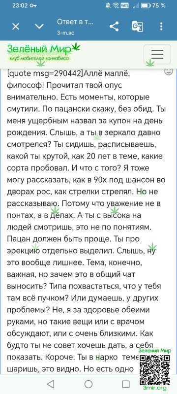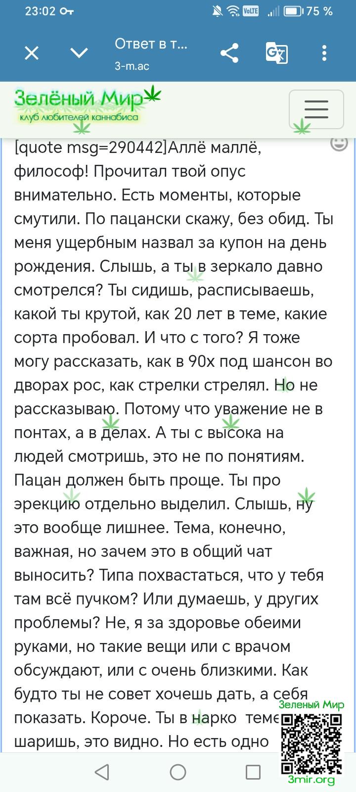 С высока я смотреть не умею, слава генетике и воспитанию, нет таких дефектов и личностных качеств.Да мне показался твой пост ущербным, так как на тот момент у тебя было всего 3 сообщения на форуме, в 1ом ты поздравляешь с 8ым марта, следом в нем же просишь подгон на др. Во 2ом посте, ты просишь скидку у русского ниги. В 3тьем,ты перечисляешь какие то заповеди травокуров. Ебать.. Уже потом, спустя какое то время ты пишешь что ты тип старый, юзал также форумы площадки которые существовали много лет назад, упомянул никнеймы всем известных ребят, и прочее.. Что тебе мешало с этого начать? Ещё удивляешься моей реакции.В этом моменте тоже в зеркало на себя глянь. Мягко говоря это выглядит странно, я конечно могу ошибатся, но по первым трём твоим сообщениям, ты мне показался душевным пернатым,ахпхах епта..