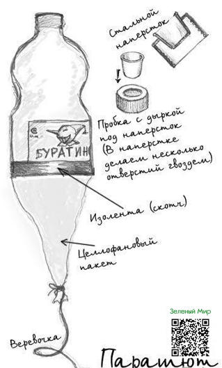 Целлофановый пакет крепим с помощью скотча к бутылке.