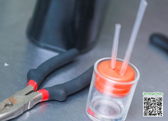 Нам потребуется: флакон, пластиковая трубка, ножик.