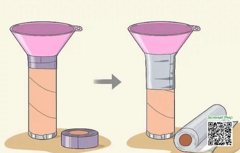 С помощью фольги и скотча прикрепите воронку к концу длинной тубы от бумажного полотенца. Необходимо, чтобы воронка указывала наружу, как это показано на рисунке. Чтобы обеспечить плотное прилегание, используйте клейкую ленту перед закреплением фольгой.