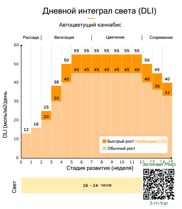 Автоцветущим растениям каннабиса требуется меньший PPFD за счет более долгого фотопериода.