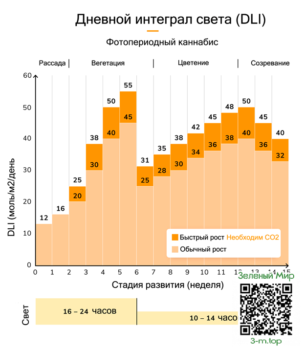 Есть и другие рекомендательные схемы, которые отличаются от этих. Например, использование света круглосуточно на этапе рассады при достаточно низком PPFD.