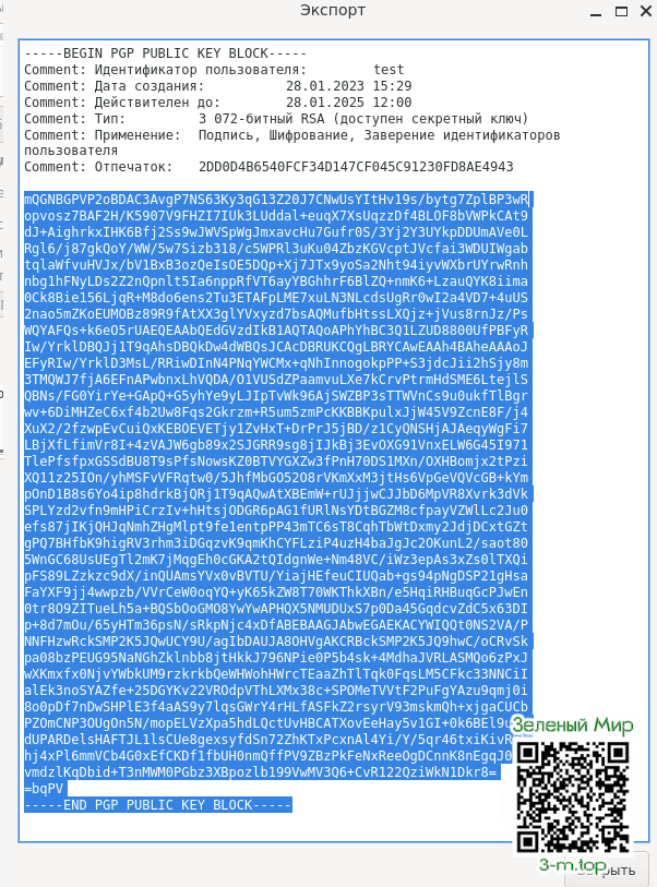 Вы указываете свой публичный ключ, жмёте "СОХРАНИТЬ" и в ответ вам приходит зашифрованное вашим же ключем огромное сообщение, которое необходимо скопировать и вставить в окно своей программы, в которой вы создавали свою связку ключей или в программу, куда вы импортировали свой секретный ключ.