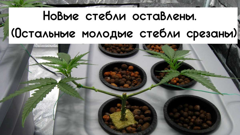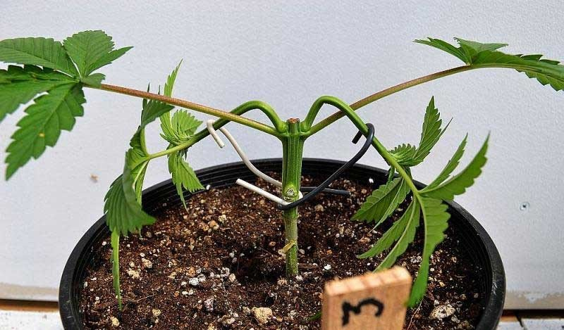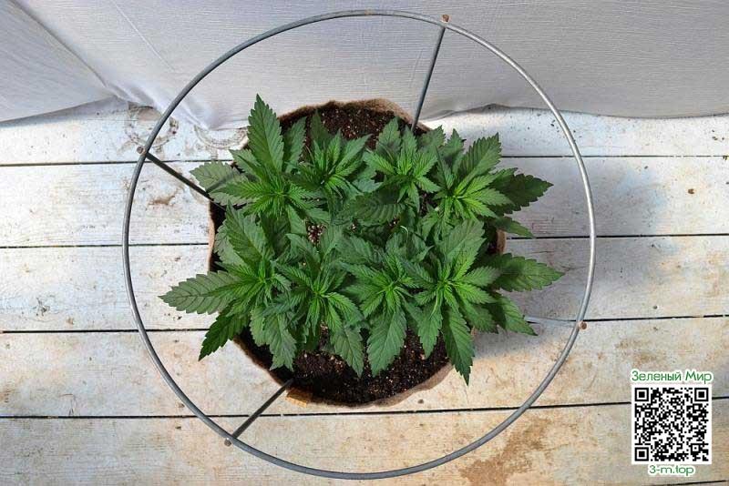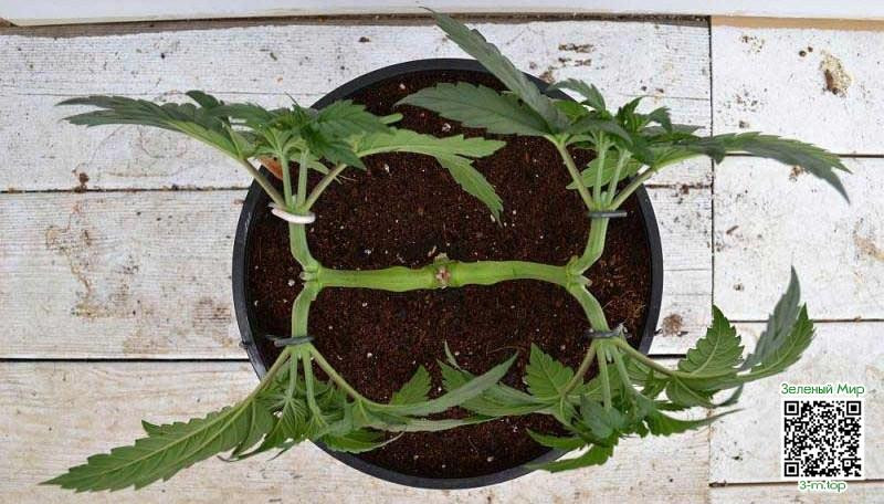 За счет подвязки первой пары стеблей растение будет ниже, а также придаст растению фирменную форму мейн-лининга.